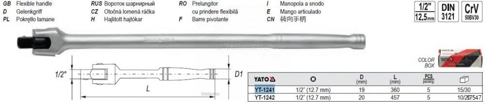 YATO Flexible Handle For 1/2" is made of CrV 50BV30 Chrome Vanadium tool Steel. The drive size is 1/2 inch. The Size of the working part is 32. The tool perfectly fits the DIN 3121 standard. The surface of the tool is finished with a chromed, satin mirror look.