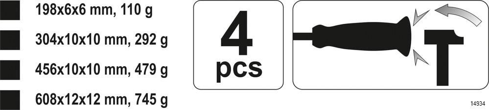 YATO Go-Through Pry Bar Set is a set of four crowbar like levers forged in carbon steel. They hardened to approximately 38 HRC with handles secured with comfortable plastic covers. The variety of sizes allows for the optimal selection of the tool for the activity performed. Perfect for use in workshops, services and garages.