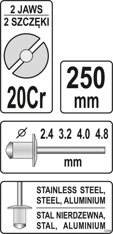 YATO Hand Riveter is a plier type riveter. Designed to handle steel, stainless steel and aluminum rivets. Supports rivets in the range of 2.4 mm, 3.2 mm, 4.0 mm, 4.8 mm. The heads is made of durable tool steel, chromium-molybdenum CrMo.