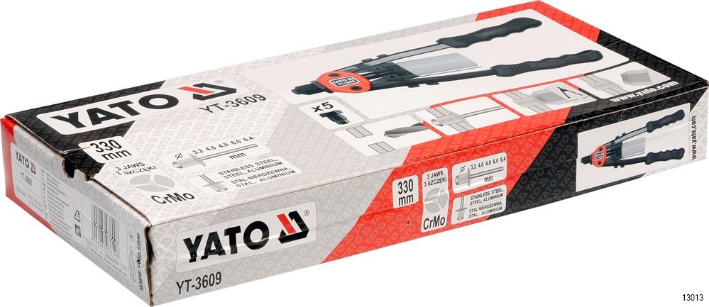 YATO Hand Riveter is a plier type riveter. Designed to handle steel, stainless steel and aluminum rivets. Supports rivets in the range of 3.2 mm, 4.0 mm, 4.8 mm, 6.0 mm, 6.4 mm. The heads is made of durable tool steel, chromium-molybdenum CrMo.