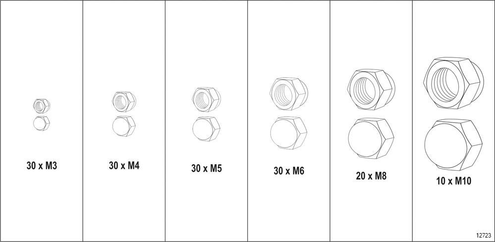 YATO Hex Nut Assortment Set is a set of 150 metric closed nuts which is assorted in size. The set includes sizes M3, M4, M5, M6, M8, M10 sizes. The pack comes in a convenient "sorter" type package.