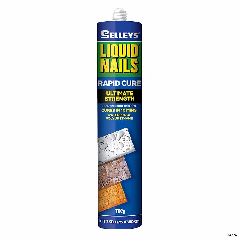 Liquid Nails Rapid Cure is an advanced, high performance polyurethane construction adhesive that cures in just 10 minutes*. It provides the ultimate strength in the Liquid Nails range. It is a durable, waterproof bond even when bonding two non porous surfaces. It bonds most building substrates.