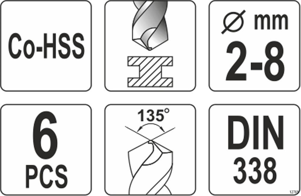 YATO HSS-CO Drill Bit Set consists of 6 cobalt metal drill bits. These drill bits have high temperature resistance and are perfect for being used in the industry for precise drilling in difficult materials, e.g. stainless steel, non-ferrous metals, plastics, stainless and acid-resistant steel.