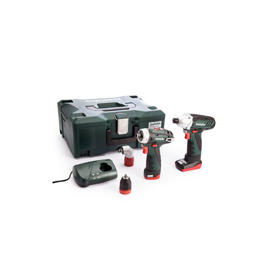 Consists of the PowerMaxx BS Quick Cordless Drill / Screwdriver and the PowerMaxx SSD Impact Screwdriver. Comes with a quick-action keyless chuck and quick-action angle adapter. 2 x Li-Power Batteries, one is 10.8V 2.0Ah and the other 10.8V 4.0Ah. Batteries are interchangeable between machines. Combo Set comes with a LC40 Charger and MetaLoc II Carry Case.