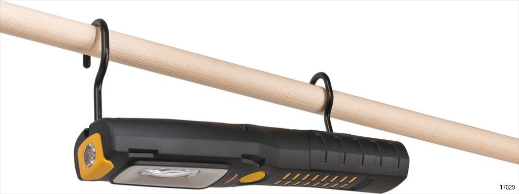 The rechargeable inspection light with On/Off switch is an energy-efficient flashlight with integrated Li-Ion battery 3.7 V /2.2 Ah and a charging indicator. Two magnets on the back and two hooks that can be rotated 360° is perfect suited for flexible use and illumination. Due to the rubberized surface, the lamp offers ideal grip. The rechargeable work light has also the following characteristics: