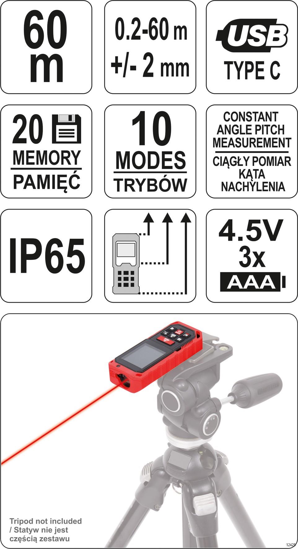 YATO Laser Distance Meter is a rangefinder for quick and precise measurements of distances.It has a resistant screen with a protection class of IP65. It has a power supply of 3 AAA NiMh batteries which is charged via USB and it has a battery status indicator. It has a reinforced housing and a short lanyard for easy handling.