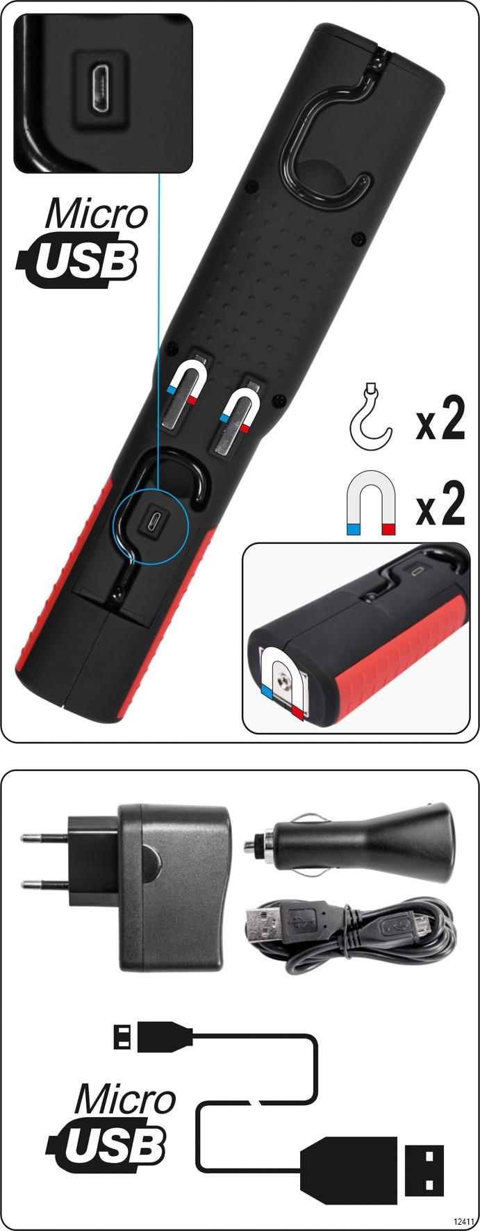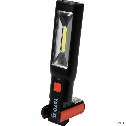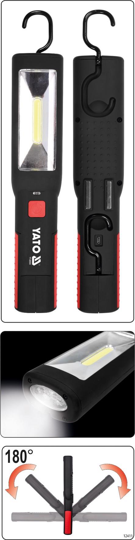 YATO LED Lamp is a professional lamp which has a modern high-efficiency COB LED , providing cold light with a luminous flux of up to 250 lumens . This color and intensity ensure optimal visibility in any workplace. In addition , 7 LEDs are installed on the head of the lamp , which act as a flashlight, enabling the illumination of hard-to-reach places. Rotating housing allows the lamp to be tilted at any angle. Thanks to this function and additionally two hooks and three magnets, it can be easily and flexibly attached. This provides the possibility of good lighting of the desired space, leaving your hands free. The lamp is powered by a capacious 1800mAh lithium-ion battery, which provides 4 hours of uninterrupted work. The battery takes 4 hours to fully charge. The lamp has a universal µUSB charging socket. The charger has a detachable USB cable, which allows you to charge the lamp from a computer, power bank or other devices with a USB socket.