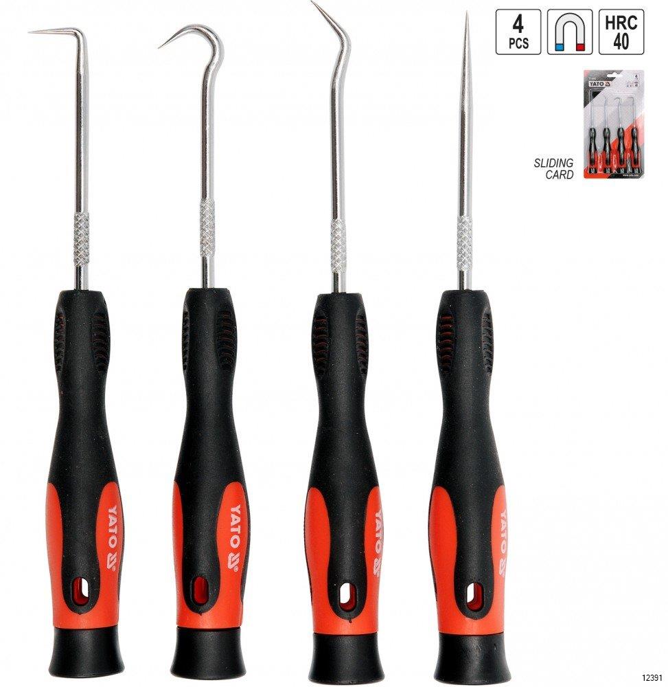 YATO Mini Pick And Hook Set is a set of 4 hooks with handle. The hooks have hardened and chrome-plated tips. The handle is made of high-quality non-slip material.