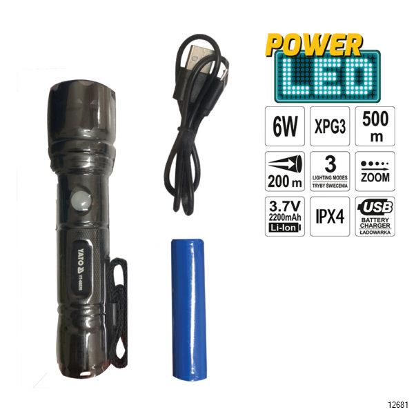 YATO Rechargeable Flashlight is equipped with modern and efficient POWER LEDs from the renowned CREE brand, as well as a comfortable hand strap and rubberized button.