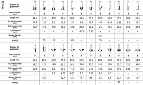 YATO Router Bit Set has precisely made, high-speed wood cutters with 8 mm shank. The heads are equipped with profiled cutting inserts, made of YG6X silicon carbide. It is silver soldered with dimensional tolerance of 0.08 mm. The edge processing cutters are equipped with bearings to facilitate the guidance of the milling machine. A set of 24 cutters, collected in a functional case with a glass for easy inspection and quick selection of the right tool.