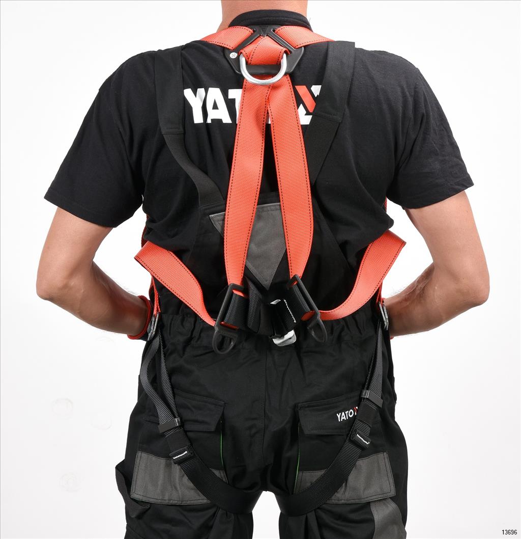 YATO Safety Harness is a system designed to protect people against falling from a height. Properly fitted harness must fit tightly to the torso and thighs so that, together with the dedicated attachment point, they can evenly distribute the forces acting on the body during a fall.