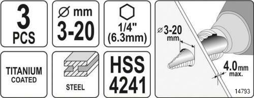 YATO Step Drill Set is intended for drilling in high-quality stainless steel, structural and cold-rolled steel, non-ferrous metals, steel sheets and plastics. It is made of high-speed steel HSS 4241, covered with Titanium Nitrite which increases the service life of the drill bits. Edges of the drilled hole remain clean and burr-free with automatic centering on rounded and slippery surfaces. Quick heat dissipation when drilling in hard materials. It has 2 spiral chip grooves for efficient dust removal.