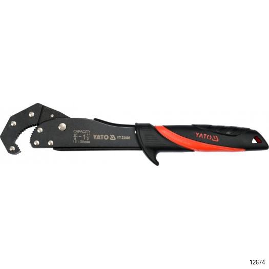YATO Auto Adjustable Pipe Wrench is a universal wrench with a length of 300 mm. Due to its movable upper jaw it allows for automatic adjustment to the size. Due to this it allows for work in the range from 16mm to 38mm. The jaws (14mm wide) are made of very hard carbon steel. They also have hardened teeth with a hardness of 46 ~ 52 HRC. The ergonomic handle is made of ABS and non-slip TPR , which significantly increase the comfort of work.