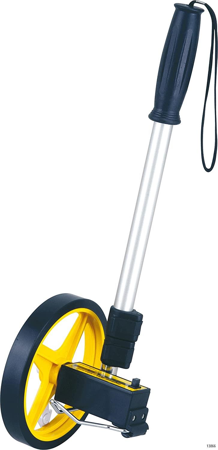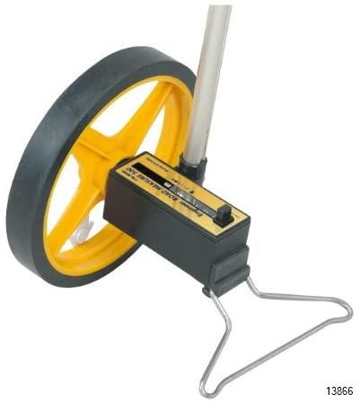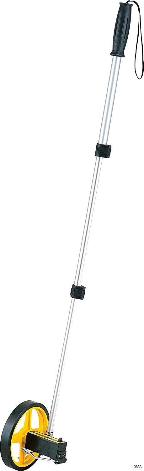 Large counter for easy reading, 3.9 ft (10 cm) increments in white with black numerals, and black numbers in black and white numbers in 3.9 ft (10 cm) increments at maximum display of 39.4 ft (9,999 m) and 35.4 ft (90 cm). Adjustable from 18.9 - 42.5 inches (48-108 cm) with 2 telescopic levers.