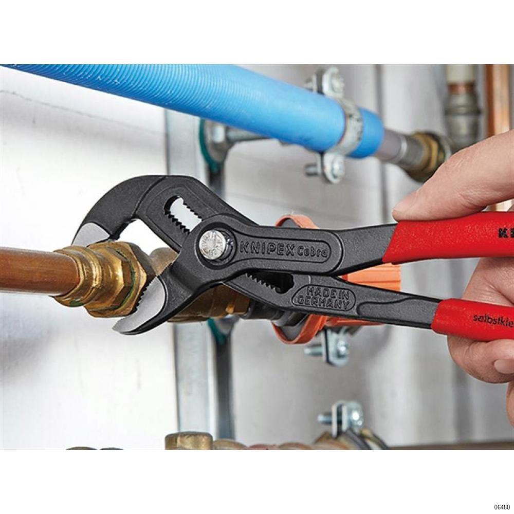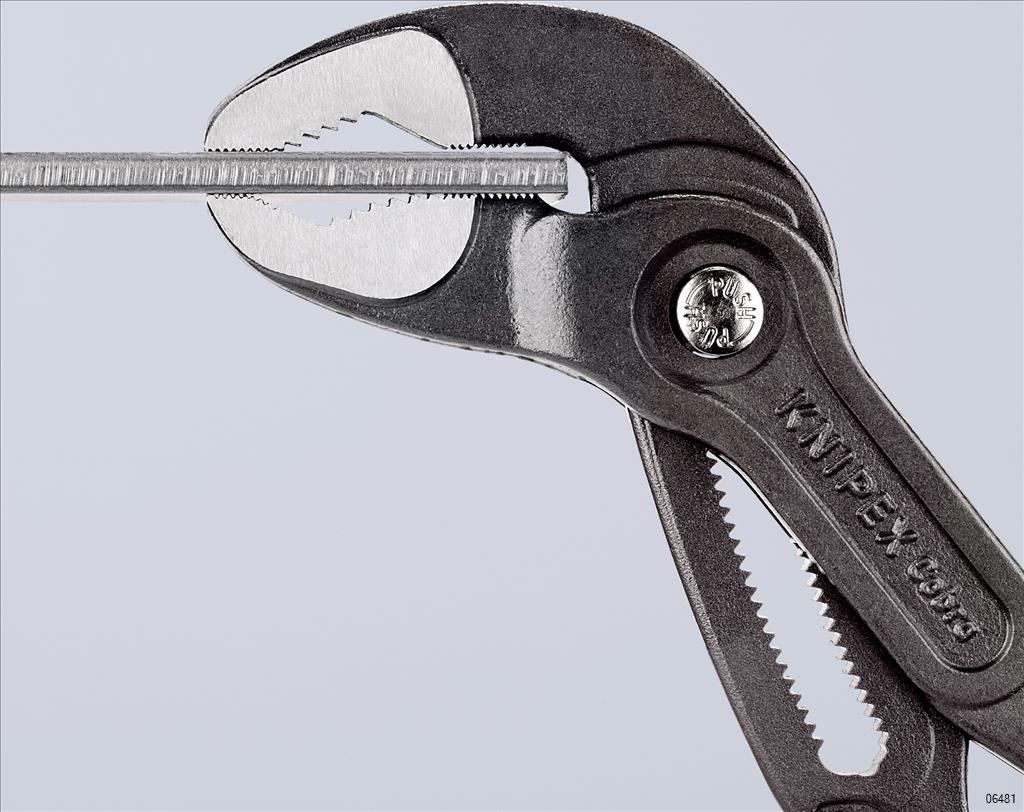 Gripping surfaces with special hardened teeth, teeth hardness approx. 61 HRC. Self-locking on pipes and nuts: No slipping on the work piece and low hand force required. Push the button for adjustment on the work piece.
