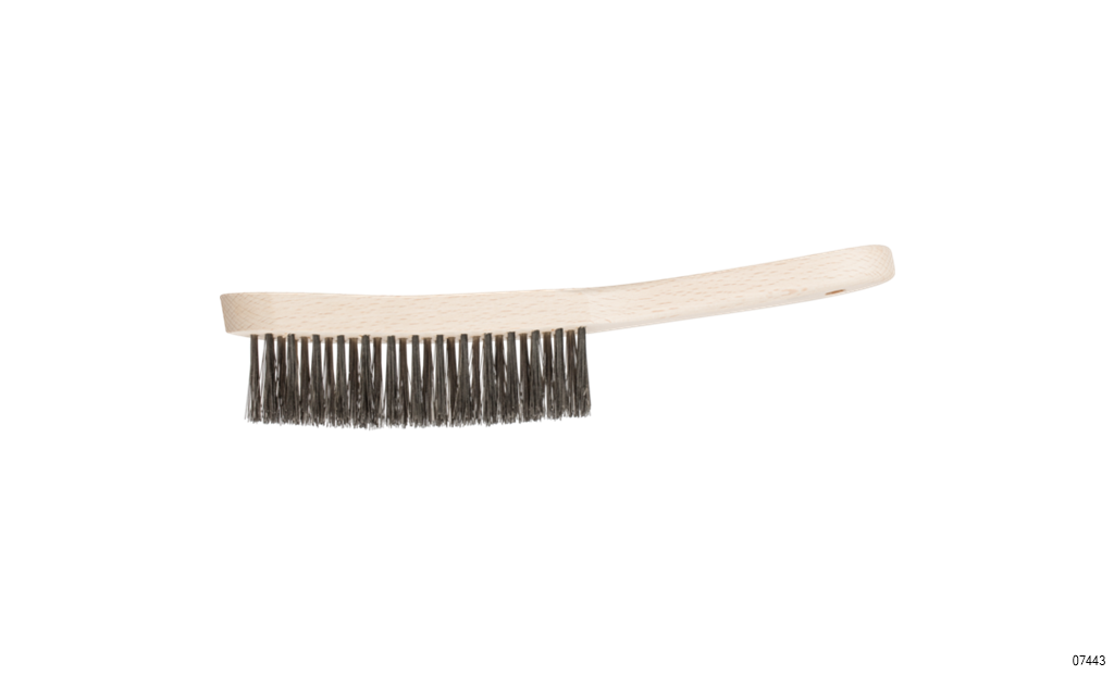 Stainless steel hand scratch brush with crimped stainless steel wire inserts for gentle cleaning.