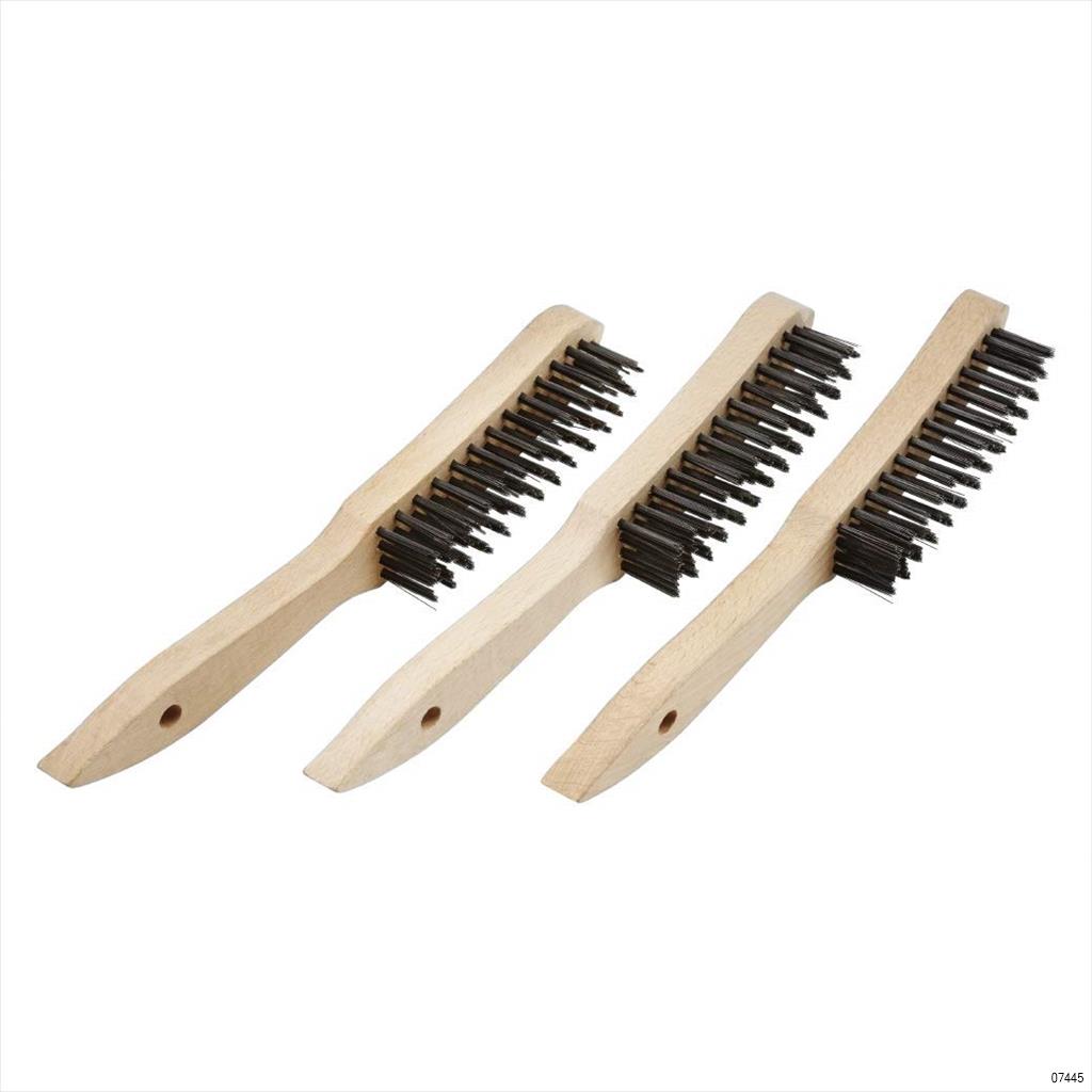 Steel hand scratch brush with straight steel wire inserts for high cleaning performance.