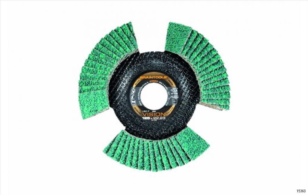 Zircon flap disc. Thanks to its three cut-outs, the LSZ F VISION becomes transparent while rotating. This enables continuous monitoring of the work result.