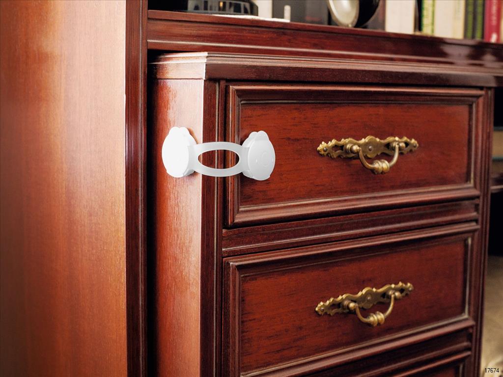 Short multipurpose safety lock that prevents the opening of closet doors, refrigerators and toilets.