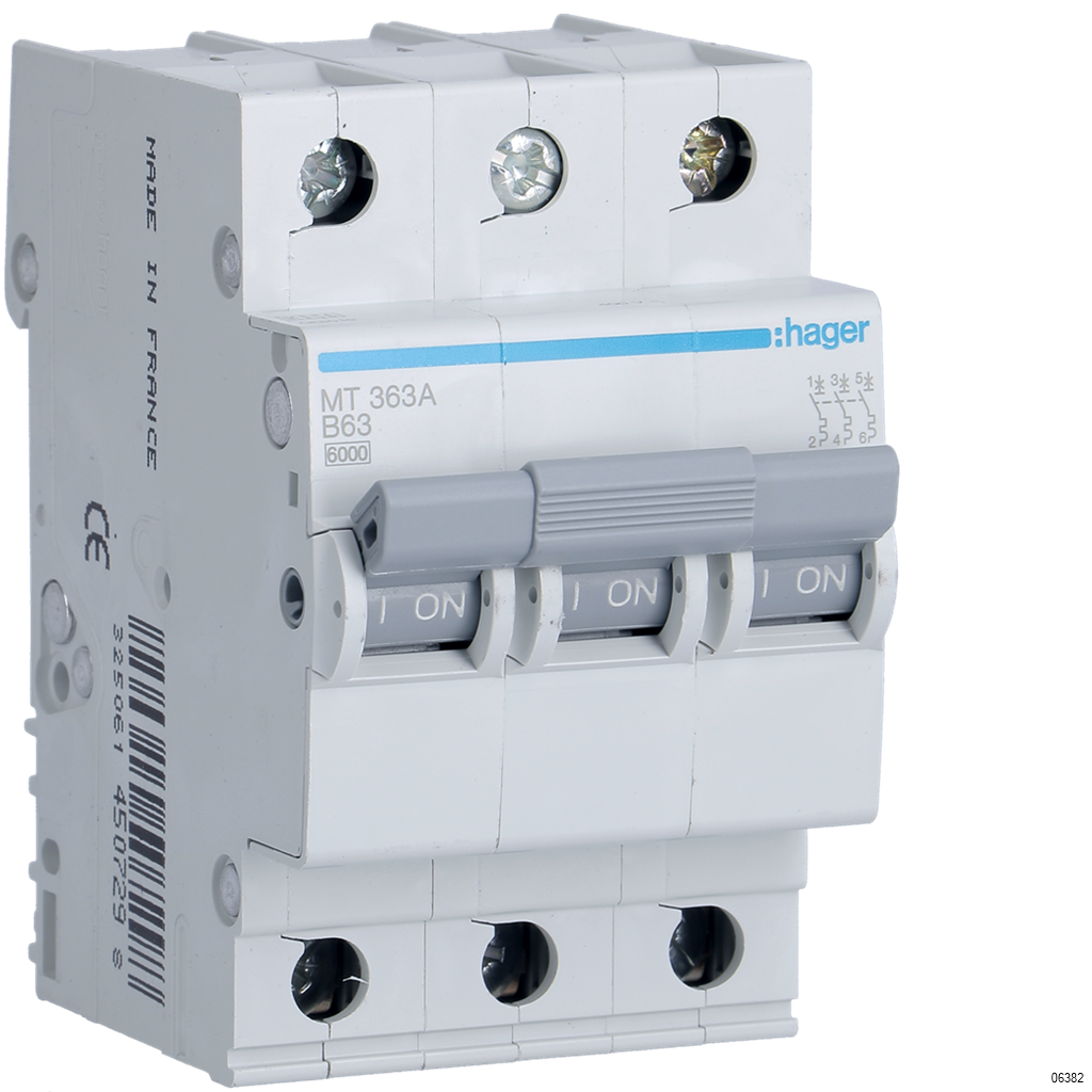 HAGER MCB C63 is an electrical switch that is automatically controlled to protect an electrical circuit from damage caused by excess current from overload or short circuiting. The central function is to interrupt current flow until a fault has been found.