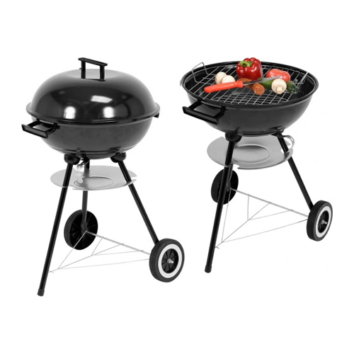 Garden grill for outdoor food preparation, with cover and ash pan.