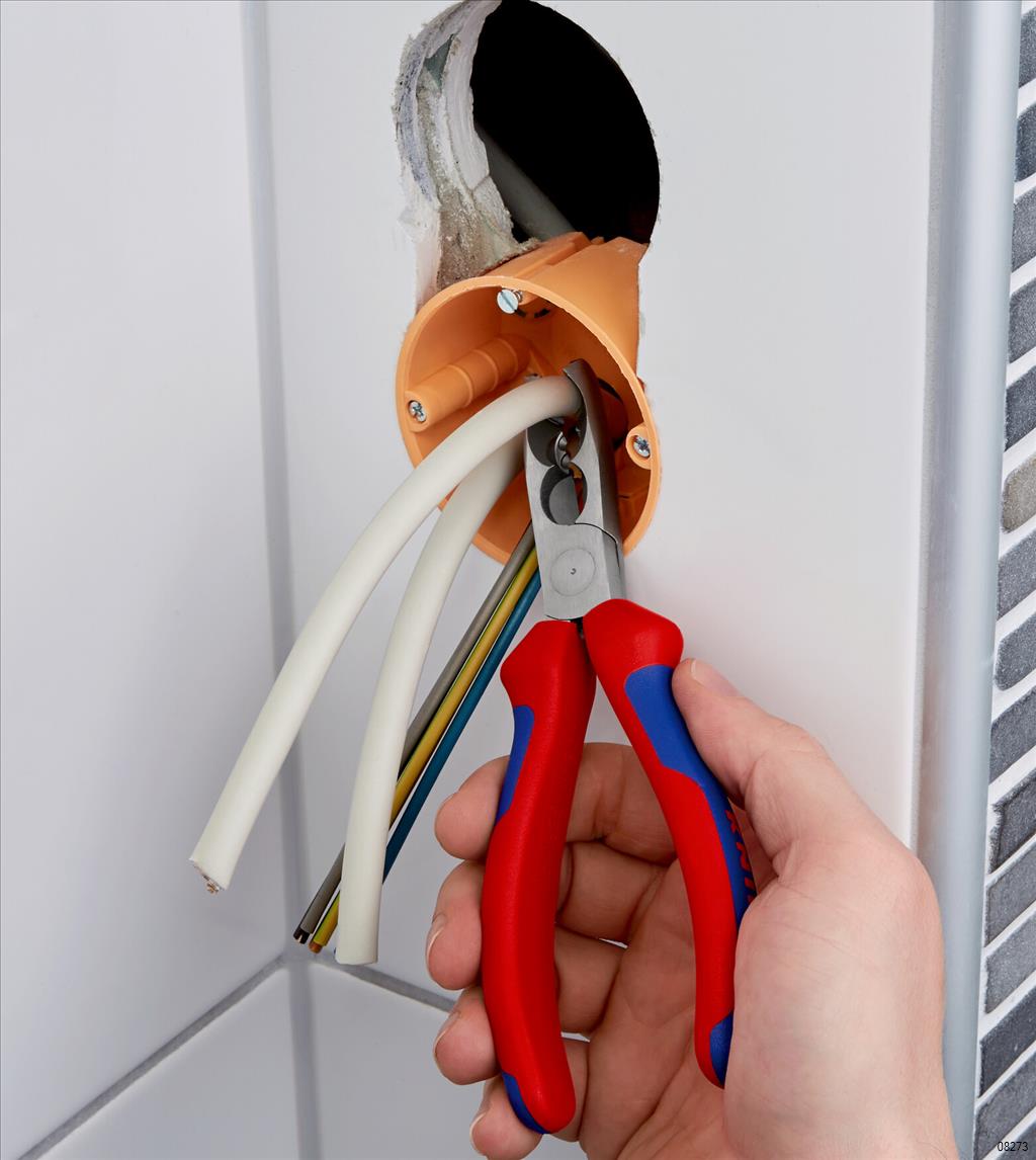 - With side cutters for cutting and trimming conductors, wires, small screws and nails