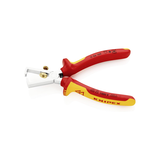 KNIPEX Stripper for single, multiple and fine stranded conductors with plastic or rubber insulation max. 5.0 mm diameter or resp. 10 mm² cable cross section, easy adjustment to the required diameter of solid or stranded wire with knurled screw and lock nut.