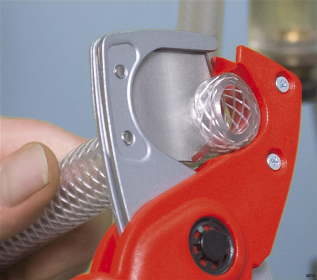KNIPEX Pipe Cutter for cutting thin walled plastic pipes (conduit plastic pipes) and flexible hoses, also with fabric reinforcement, of plastic and rubber up to 25.0 mm / 1" exterior diameter.