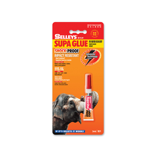 Selleys Supa Glue Shock Proof is a high strength, rubber modified cyanoacrylate based adhesive that dries clear.