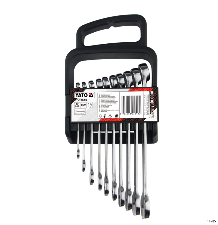 YATO Combination Wrench Set contains 10 wrenches made of chrome vanadium steel. These are perfect for work in professional workshops under variable loads. Especially because these tools meet the international DIN 3113 standards. The wrenches have an aesthetic satin finish and a polished head which also minimize slippage of oil contaminated spanner when working.