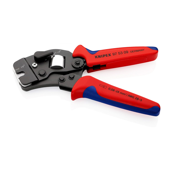 KNIPEX Crimping Plier includes compression from 0.08 - 10.0 and 16.0 mm² in one profile. With selector lever for setting the crimping area either to 0.08 - 10 mm² or 16 MM131. This is suitable in particular for all twin end sleeves (ferrules) up to 2 x 6 mm² or 2 x AWG 9.