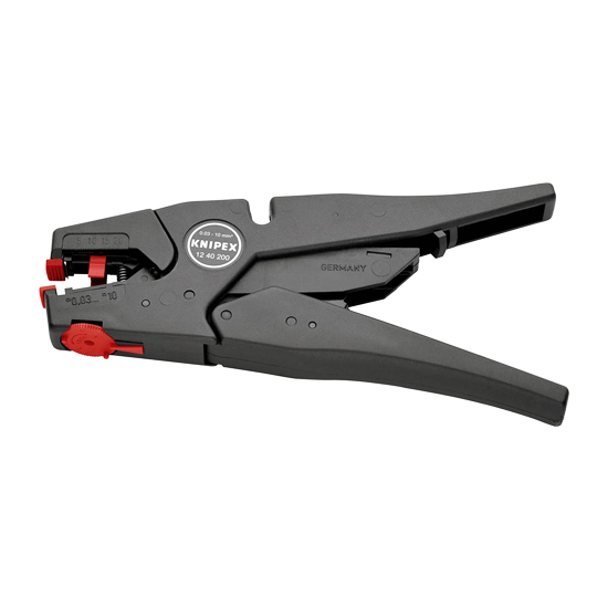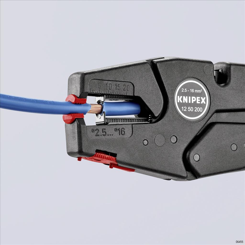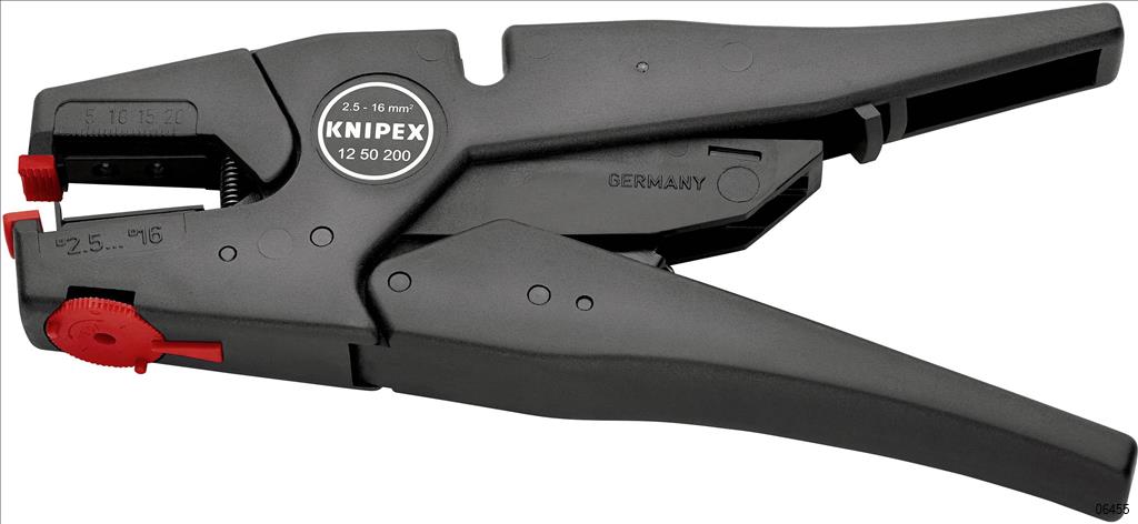 Knipex Self Adjusting Insulation Stripper used for single, multiple and fine stranded conductors with plastic or rubber insulating. Adapts automatically to the respective cable cross-section, preventing damage to the conductor. The cutting depth can be adjusted for different insulation materials.