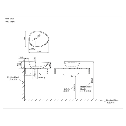 INOCCI WASH BASIN COUNTER TOP 48CM ROUND (480X385X170MM) NC2275W