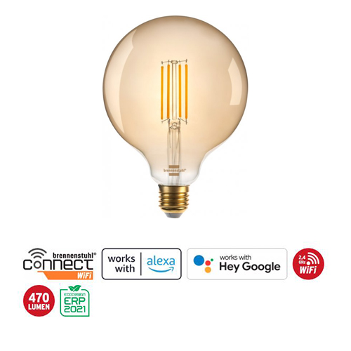 The smart brennenstuhl®Connect WiFi Filament led bulb Globe in vintage design allows you to control your home, no matter where you are. Operate your lighting, such as your living room lighting, conveniently via the free brennenstuhl®Connect app or via voice control with Amazon Alexa or Google Assistant. Create scenes for your individual lighting atmosphere for different rooms and occasions such as reading, parties, kitchen and living room. Thanks to the integrated timer, you can also set up flexible timer functions so that the light bulb is automatically switched on and off. Compatible with any brand of router and does not require a hub. When connecting, make sure to select the 2.4 GHz band. In addition, the smart light bulb convinces with the following features:
