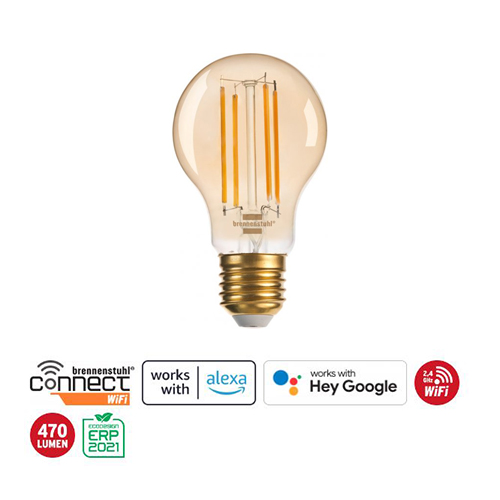 The smart brennenstuhl®Connect WiFi Filament LED bulb Standard allows you to control your home, no matter where you are. Operate your lighting, such as your living room lighting, conveniently via the free brennenstuhl®Connect app or via voice control with Amazon Alexa or Google Assistant. Create scenes for your individual lighting atmosphere for different rooms and occasions such as dining room, living room, restaurant, bar, café, hotel, shop or party. Thanks to the integrated timer, you can also set up flexible timer functions so that the light bulb is automatically switched on and off. Compatible with any brand of router and does not require a hub. When connecting, make sure to select the 2.4 GHz band. In addition, the smart light bulb convinces with the following features: