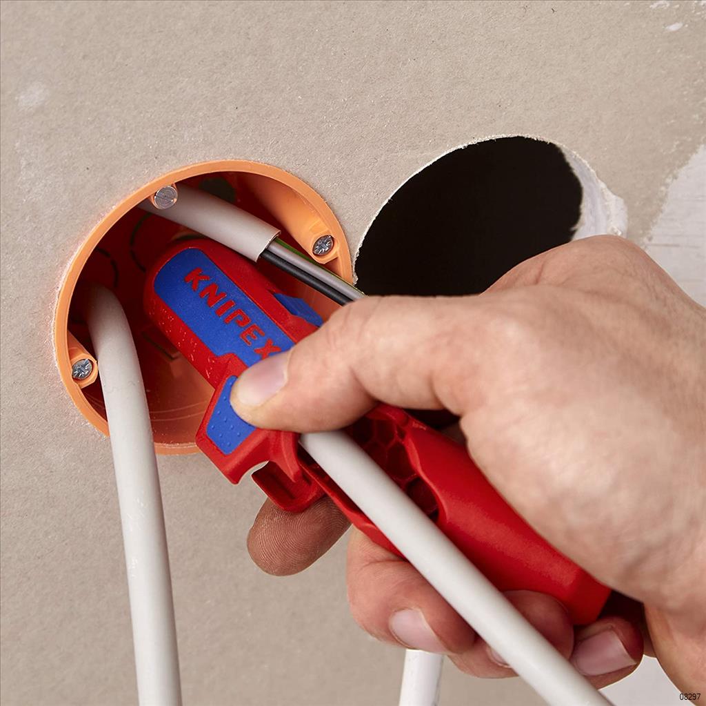 KNIPEX Universal Dismantling Tool is ideal for the fast and precise dismantling and stripping of all common round and damp-proof installation cables (e.g. NYM cable 3 x 1.5 mm² up to 5 x 2,5 mm²), data cable (e.g. twisted pair) and coax cable.