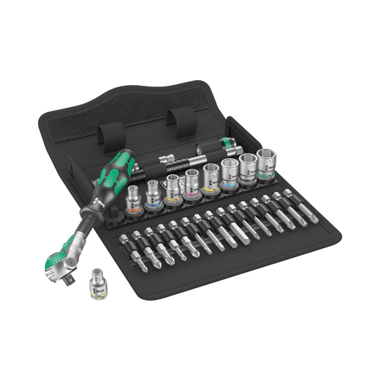 This Rachet Set is an incredibly compact set arrangement with many tools in a minimum of space. A completely new ratchet set that with a unique textile boxes that are very robust and durable. They can be positioned upright for tidy storage on the workshop shelf. Additional surface protection due to textile outer material. Low weight and volume for simpler mobility. 'Take it easy' Tool Finder with colour coding according to sizes.