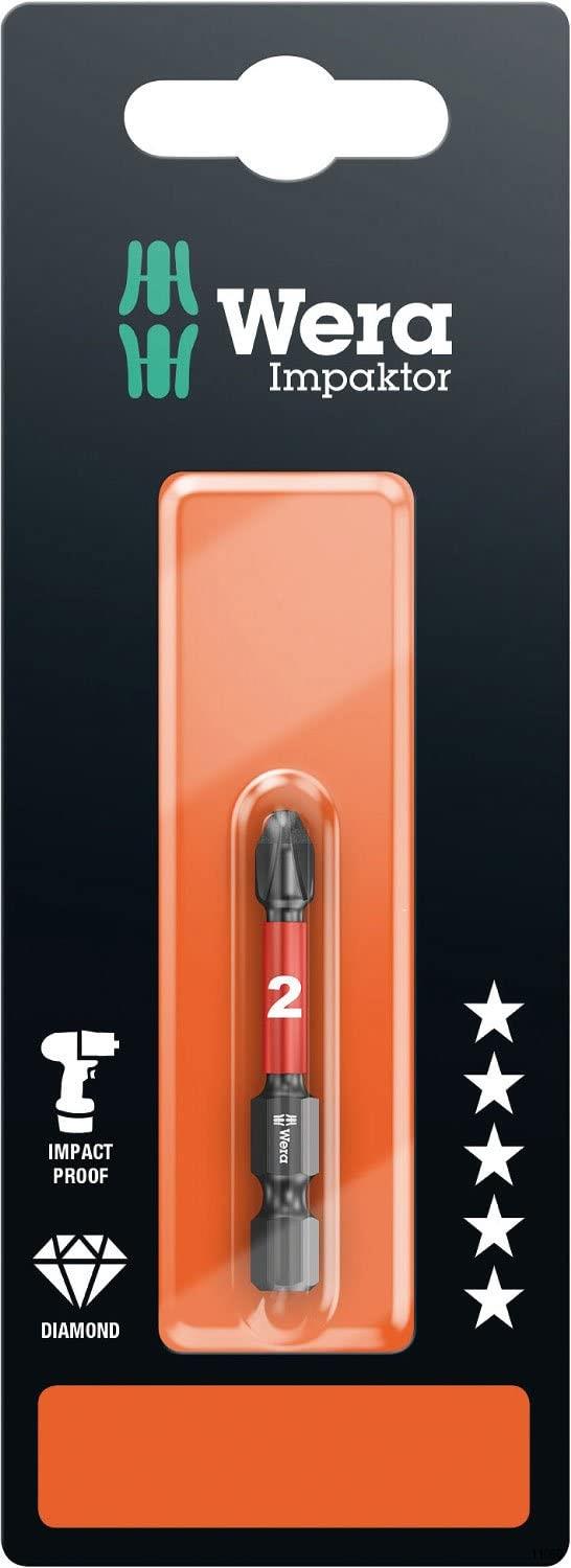 WERA High quality bits for Phillips screws. The impact technology offers an above-average service life even under extreme circumstances. Enhanced friction resistance, thanks to the rough diamond-particle coating on the bit tip, prevents any slipping out of the screw head. Particularly suitable for use with customary impact drivers. ¼” hexagon, suitable for holders as per DIN ISO 1173-f 6.3.
