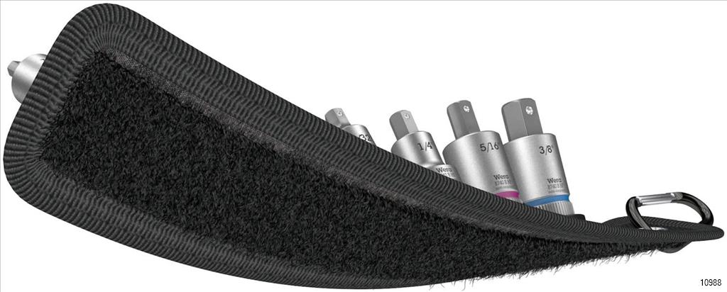 WERA designed robust textile belt with 8 in-hex bit-sockets taking up minimal space. A smooth twist to unlock mechanism ensures a secure fit and simple removal of the sockets. Comes with "Take it easy“ Tool Finder with colour coding according to size to enable the right tool to be selected easily and quickly. Includes a snap hook for secure fastening to a belt loop or pocket.