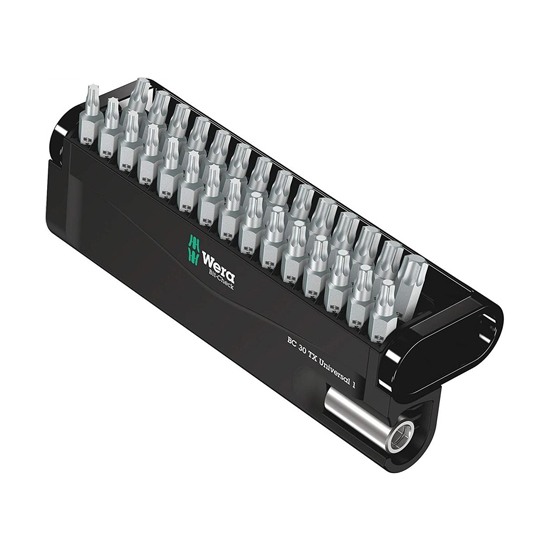 WERA bit-check with 29 bits and bit holder with stainless steel sleeve, snap ring and strong permanent magnet for the recording of bits according to DIN ISO 1173-C 6.3.