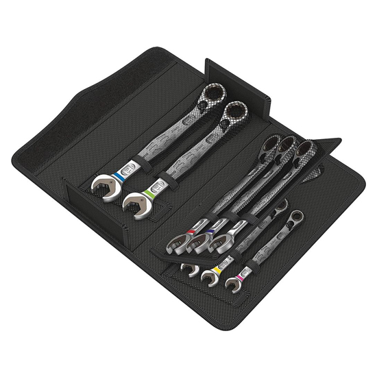 Joker ratcheting combination wrenches with angled ratchet head and switch lever. The metal plate in the jaw provides for the holding function which reduces the risk of losing nuts and bolts.