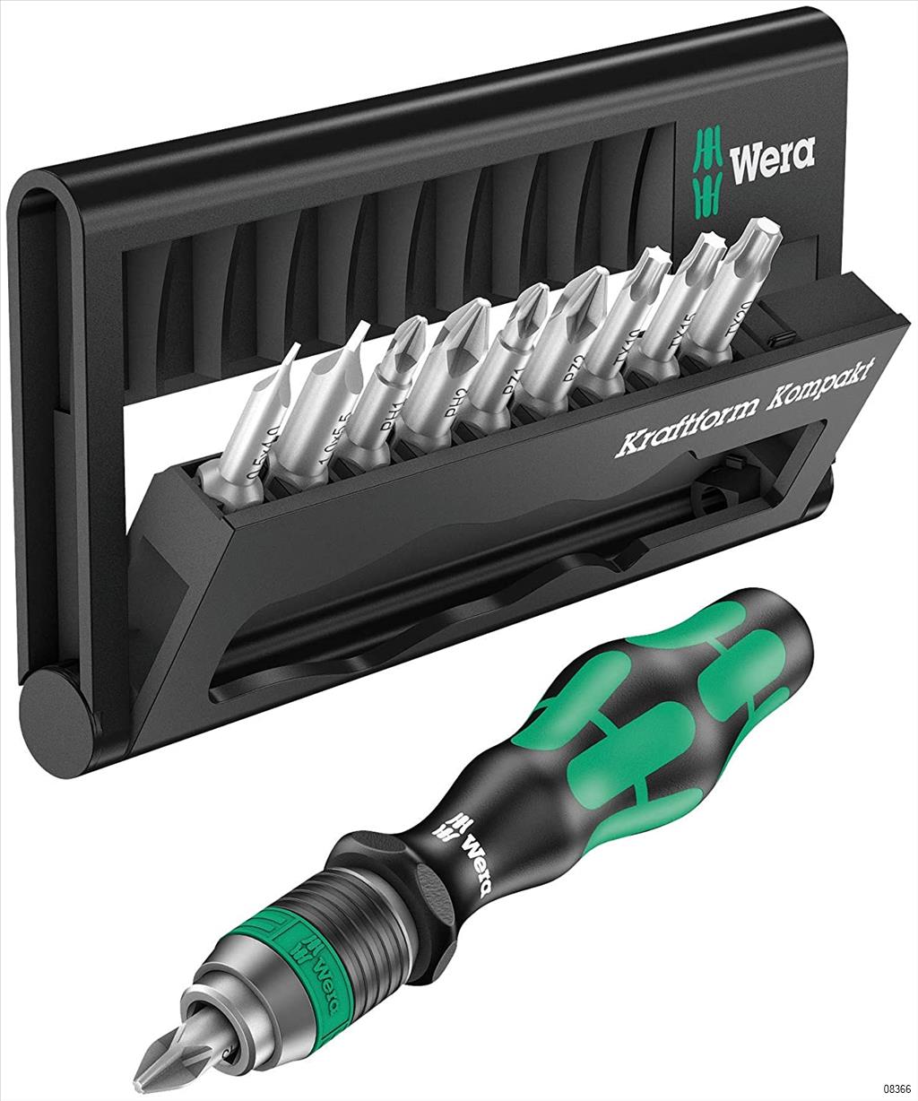 Wera 10 Piece, Kraftform Kompakt 10 is designed as the compact tool for everyday use. Wera’s Kraftform bitholder features the Rapidaptor with quick-release chuck that allows for quick one-handed bit insertion and removal for insert and power bits.