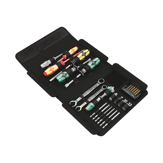 | Contents | 2 JOKER open-end wrenches, the ¼ ”Zyklop ratchet and accessories, 6 x 89 mm bits, 5 multi-component Kraftform Plus screwdrivers and voltage tester. Two JOKER combination ratcheting wrenches with special holding plate, 1 Zyklop ratchet 8000 A (1/4 "), 3 Zyklop sockets 8790 HMA, 1 Zyklop adapter 8784 A1 for bits; 6 TORX HF bits 867/4 with holding function for TORX screws, 1 voltage tester 247; 2 Kraftform series 100 slotted screwdrivers 160 i and 160 iS, 1 Kraftform Chiseldriver 932 A (slotted) with hex blade, 2 nutsetters 395 HO with hollow shaft