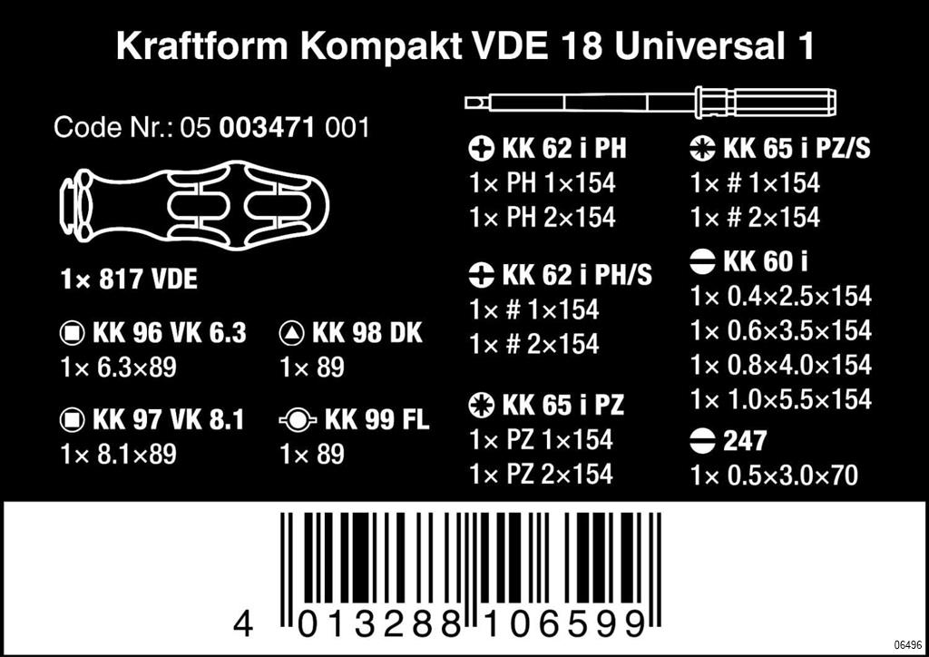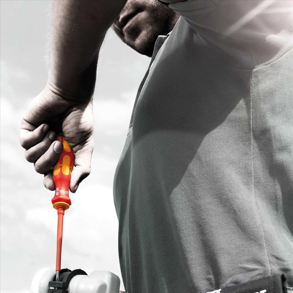 16 VDE interchangeable blades with 817 VDE Kraftform handle in a robust belt pouch. Individually tested tools as per IEC 60900. Individual test in water bath at 10,000 volts for secure work at the permissible voltage of 1,000 volts.