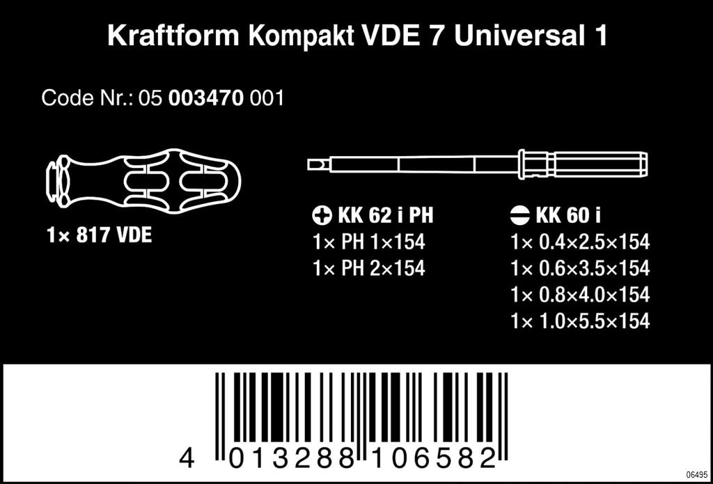 6 VDE interchangeable blades with 817 VDE Kraftform handle in a robust belt pouch. Individually tested tools as per IEC 60900. Individual test in water bath at 10,000 volts for secure work at the permissible voltage of 1,000 volts.