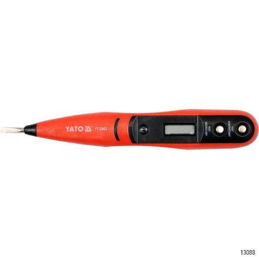 YATO Digital Voltage Tester is in the range of 12 - 250 V. It is intended for mechanics, conservators servicing electrical installations and for ordinary users of home sockets. The occurrence of voltage is indicated on the LCD screen. The test is performed "by touch" or inductively only by bringing the indicator closer to the tested installation. This item does not require battery.